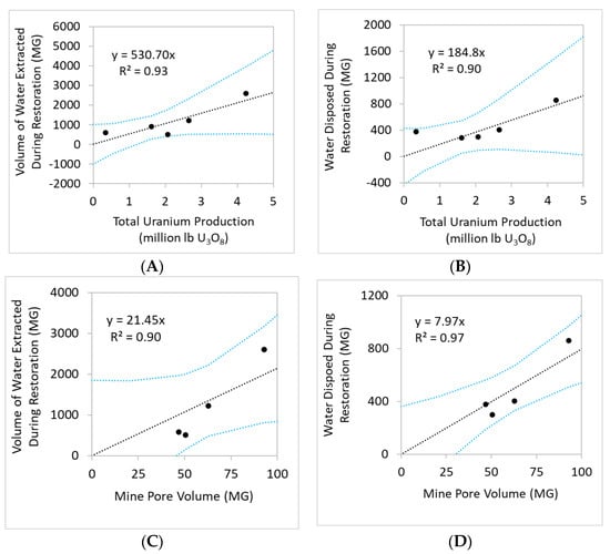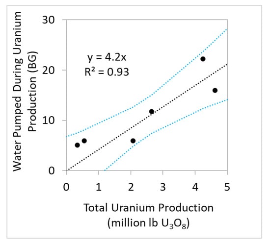 Volume of water pumped during the uranium production phase as a function of uranium produced (as lb U3O8) for the six ISR operations listed in Table A1. Compiled data used to construct these graphs as well as associated references are publicly available online []. Note BG = billion gallons. Black line is the linear trend line and blue lines are the 95 percent confidence intervals.