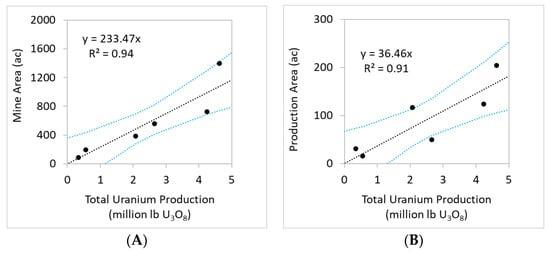 (A) Mine area and (B) production area as a function of uranium produced (as lb U3O8) for the six ISR operations listed in Table A1. Compiled data used to construct these graphs as well as associated references are publicly available online []. Note: ac = acres. Black line is the linear trend line and blue lines are the 95 percent confidence intervals.
