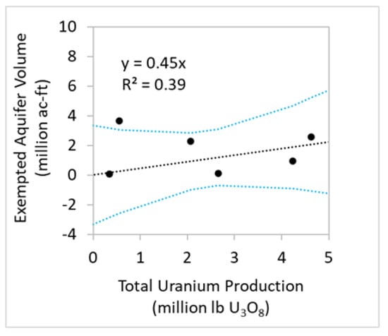 Exempted aquifer volume as a function of uranium produced (as lb U3O8) for the six ISR operations listed in Table A1. This volume is the total physical volume of aquifer computed by multiplying the exempted area by the exempted aquifer thickness. Compiled data used to construct these graphs as well as associated references are publicly available online []. Note: ac-ft = acre-feet. Black line is the linear trend line and blue lines are the 95 percent confidence intervals.
