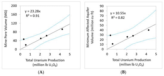 (A) Mine pore volume and (B) minimum affected aquifer volume as a function of uranium produced (as lb U3O8) for Kingsville Dome, Mt. Lucas, Palangana Dome, Palangana and Rosita. Alta Mesa was not included because a pore volume was not reported. Compiled data used to construct these graphs as well as associated references are publicly available online []. Note: MG = million gallons, cu ft = cubic feet. Black line is the linear trend line and blue lines are the 95 percent confidence intervals.