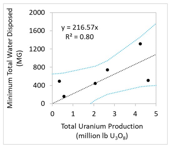 Minimum total volume of water disposed as a function of uranium produced (as lb U3O8) for the six ISR operations listed in Table A1. Compiled data used to construct these graphs as well as associated references are publicly available online []. Note: MG = million gallons. Black line is the linear trend line and blue lines are the 95 percent confidence intervals.