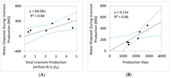 Water disposed during the uranium production phase as a function of (A) amount of uranium produced (as lb U3O8) and (B) production days for all six ISR operations. Compiled data used to construct these graphs as well as associated references are publicly available online []. Note: MG = million gallons. Black line is the linear trend line and blue lines are the 95 percent confidence intervals.