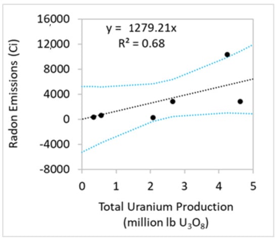 A primary radioactive emission from the process streams of the production wellfield is thought to be radon gas []. Actual radon released could be lower from in-situ recovery operations than conventional mining due to the lack of open deposit pits, tailings and ore stockpiles, however, it is also likely that during operation the release of radon gas would be above normal baseline for the equivalent region being mined [,]. The radon released could be accounted for from the processing plant with minor components from liquid waste storage ponds, the well heads and waste scale buildup (for example, calcite for alkaline ISR) [,].