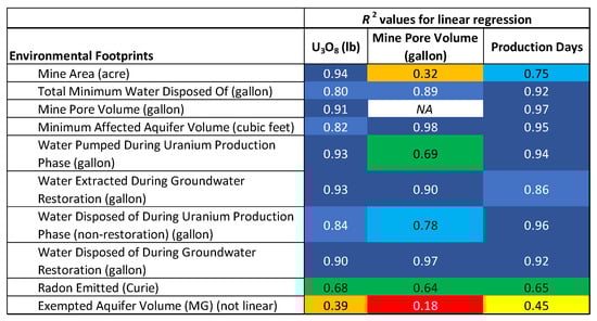 The data were plotted as a function of uranium production, as pounds (lb U3O8). A trendline was added using a model Y = m × X, without a constant term, where Y is the indicator of interest, X is pounds of U3O8 and m is the slope of the line. This model assumes Y must be 0 when X = 0, that is, there is no water use, disposal, or disturbance if there is no uranium production via ISR. Linear regressions were also provided for other variables for which data were available, namely pore volume and production time, to determine how these parameters were related to the environmental footprints.