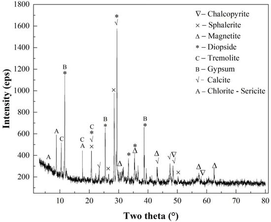 The XRD spectrogram (Figure 1) indicated that there were several kinds of minerals in the polymetallic ore, and its detailed mineral composition is shown in Table 2. These reveal that chalcopyrite, sphalerite, and magnetite were the main valuable minerals, and diopside, chlorite, calcite, gypsum and tremolite were the main gangue minerals. Besides, there was a small amount of quartz and limonite.