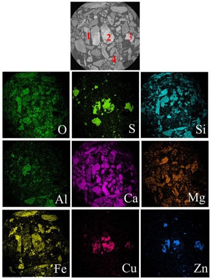 The SEM backscattered electron image and surface scan maps of main elements in the polymetallic ore (1—Iron oxide; 2,3—Copper-zinc sulphide; 4—Aluminosilicate).