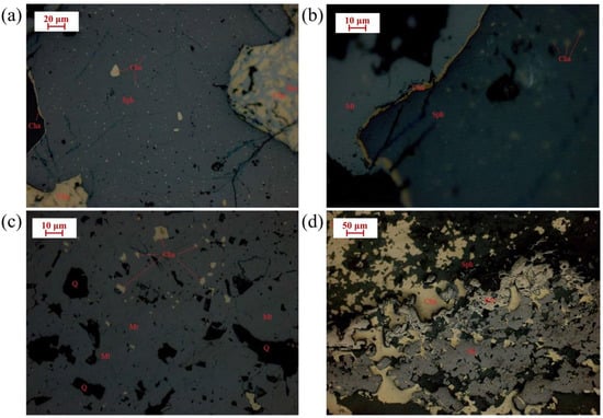 Association and dissemination properties of the main minerals. (Cha-chalcopyrite, Sph-sphalerite, Mt-magnetite, Q-quartz. (a) Chalcopyrite was distributed in sphalerite; (b) Chalcopyrite contacted with magnetite and sphalerite; (c) Chalcopyrite was distributed in magnetite; (d) Chalcopyrite contacted with magnetite).