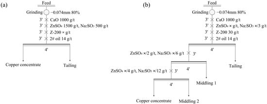 Experimental flow charts for the effects of Z-200 (a) and ZnSO4 + Na2SO3 (b) dosages on copper flotation.