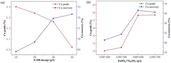 Effects of Z-200 (a) and ZnSO4 + Na2SO3 (b) dosages on copper flotation.