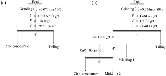 Experimental flow charts for the effects of BX (a) and CuSO4 (b) dosages on zinc flotation.