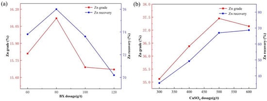 Effects of BX (a) and CuSO4 (b) dosages on zinc flotation.