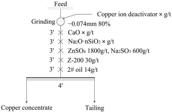 Experimental flow chart of the effects of copper ion deactivator, CaO and Na2OnSiO2 on rough copper flotation.