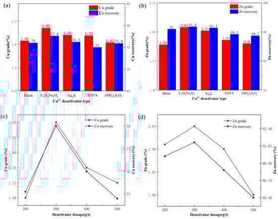 Effects of deactivator type (a,b) and dosage (c,d) on rough copper flotation.