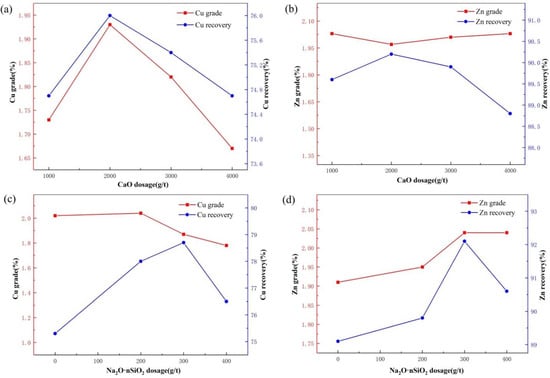 Effects of CaO (a,b) and Na2O nSiO2 (c,d) dosages on rough copper flotation.