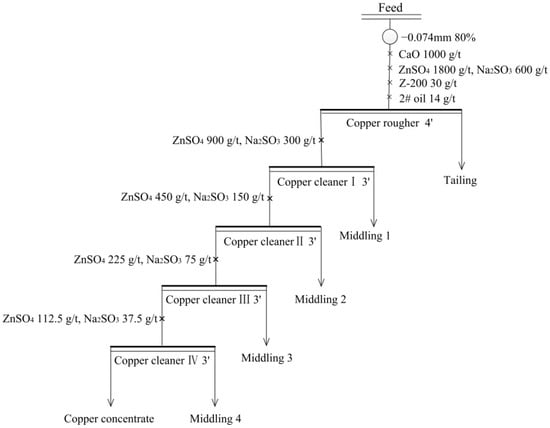 The separation and enrichment of copper and zinc minerals from the raw ore by flotation mainly depend on the reagent regime and the flotation process. The Z-200 (O-isopropyl-N-ethyl thionocarbamate) collector selected in this experiment is a common and efficient copper collector. To effectively inhibit zinc flotation during the copper flotation process, ZnSO4 and Na2SO3 were selected as combined inhibitors. The effects of the collector and inhibitor dosages on copper flotation were first studied, and the experimental flow charts and results are shown in Figure 4 and Figure 5, respectively. Under the dosage for ZnSO4 + Na2SO3 of 1500 + 500 g/t, the grade of copper concentrate decreased, and copper recovery increased with the increase of the Z-200 dosage. When the dosage reached 30 g/t, its further increase would cause a substantial drop in the copper grade, but not make a significant improvement in copper recovery. The zinc recovery of concentrate usually decreased with increasing zinc inhibitor dosage. So, the copper grade and recovery both increased with the increase of ZnSO4 + Na2SO3 dosage in the range of 1200 + 400 g/t to 1800 + 600 g/t, as shown in Figure 5b. After that, there was no obvious change in the copper grade, and the recovery dropped. Therefore, the optimal dosages of Z-200 and ZnSO4 + Na2SO3 in the rough copper flotation were 30 g/t and 1800 + 600 g/t, respectively.