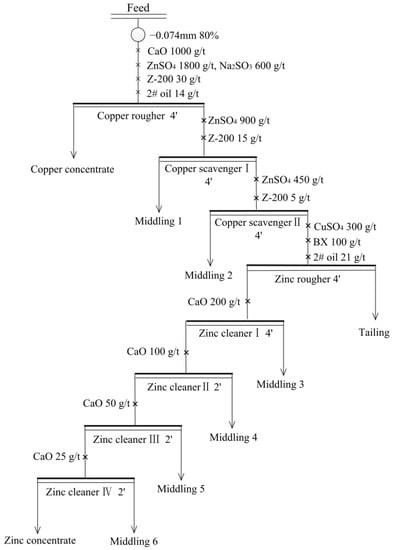The usual way for separating iron minerals from copper and zinc sulphide minerals is magnetic separation, and flotation is the most common method of enriching the copper and zinc [,,,,,]. Therefore, a combined flotation-magnetic separation process is often used to separate and enrich copper, zinc, and iron from a polymetallic ore. But it is still very difficult to achieve the complete separation of copper and zinc by flotation [,]. The main reasons are as follows: (a) copper and zinc minerals are embedded in each other tightly, which makes it difficult to dissociate the copper and zinc minerals monomer; (b) during the grinding process, copper ions in the slurry are adsorbed on the surface of sphalerite, resulting in that sphalerite has similar floatability with chalcopyrite [,,,]; (c) the copper and zinc sulphide minerals are prone to be oxidized, which leads the deterioration of their floatability [,,]. Formulating a reasonable beneficiation process and selecting an appropriate reagent regime based on ore characteristics are the keys to separate copper and zinc sulphide minerals. The main processes of flotation separation of copper and zinc sulphide minerals include differential flotation, mixed flotation, and iso-flotation []. The characteristic of mixed flotation, is that as much copper and zinc sulphide minerals as possible are floated out together after the first grinding stage. The mixed concentrate is reground for further separation of these metals by flotation. The disadvantage of this process is that the mixed concentrate contains many reagents, which makes the subsequent minerals separation difficult []. The feature of iso-flotation is that the copper sulphide minerals and part of the zinc sulphide minerals with good floatability are floated at the same time. Then the copper and zinc minerals in the mixed concentrate are separated after its regrinding, and the zinc minerals with poor floatability in the tailings are separately floated off. So, this kind of process is complicated []. Differential flotation allows the copper minerals to be floated first and then the zinc minerals are subsequently floated from the copper tailings, however, it requires high selectivity of the copper collector. In industry, the simplicity of this process combined with the high selectivity of the collector Z-200 (O-isopropyl-N-ethyl thionocarbamate) promotes it to be used widely [].
