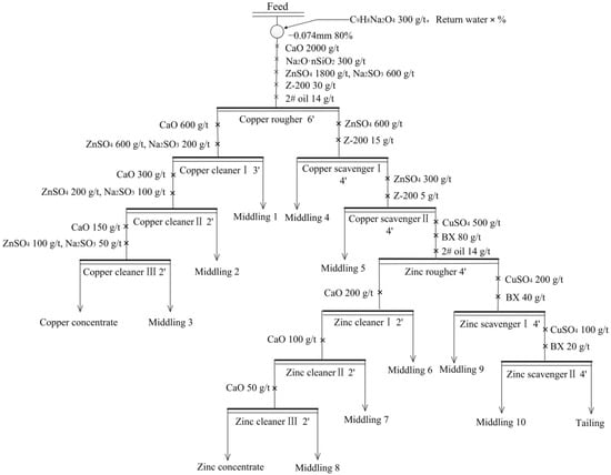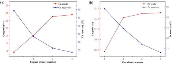 Increasing the numbers of cleaning cycles could improve the grade of concentrate. The experimental flow charts for the effect of numbers of cleaning cycles for copper and zinc flotations are shown in Figure 11 and Figure 12, and the results are shown in Figure 13. The grades of copper and zinc concentrates both increased sharply with the increase in number of cleaning cycles in the range of 1–3, while after three cycles the increase was insignificant. Therefore, the optimal number of copper and zinc cleaning cycles both were 3.