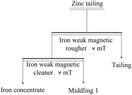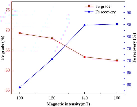Iron in zinc tailings, mainly existed as magnetite having strong magnetism, so iron could be effectively recovered by magnetic separation. The experimental flow chart of the effect of magnetic intensity is shown in Figure 14, and the results are given in Figure 15. Iron recovery of magnetic concentrate increased greatly, and iron grade decreased moderately, with the increase of magnetic intensity in 100–140 mT. With the further increase of magnetic intensity, iron recovery had no significant change. Therefore, the optimal magnetic intensity of magnetic separation was 140 mT.