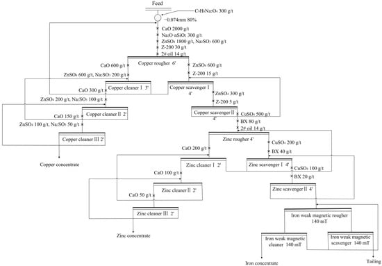 A comprehensive recovery process was developed in this work to realize the separation and enrichment of copper, zinc, and iron minerals from a polymetallic ore, where the scavenger numbers of copper and zinc flotations and iron magnetic separation, respectively, were 2, 2 and 1, based on industry experience. To evaluate the effectiveness of this process, a closed-circuit experiment whose flowchart is shown in Figure 16 was carried out, in which the reagent dosages were decreasing in order from rough flotation to each cleaner stage and scavenger flotations. The cyclic number of this closed-circuit test was 5, and the average values of the last three cyclic tests results are listed in the Table 9. The grades of copper, zinc, and iron in their respective concentrates arrived at 20.31%, 45.97% and 63.39%, and their recoveries reached 86.1%, 87.6% and 77.8%, respectively. So, the separation and enrichment of copper, zinc and iron minerals were well realized by the developed comprehensive recovery process. In addition, silver also was enriched in the copper concentrate, whose Ag grade and recovery separately was 532 g/t and 79.5%.