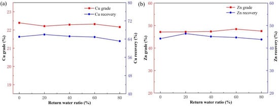 Effect of return water ratio on copper flotation (a) and zinc flotation (b).