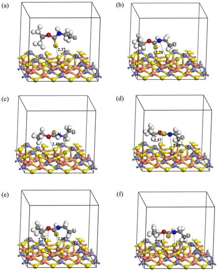 Optimized adsorption configurations of Z-200 on chalcopyrite (112) crystal plane ((a) adsorption of carbonyl S; (b) adsorption of N; (c) adsorption of O; (d) simultaneous adsorption of carbonyl S together with N; (e) simultaneous adsorption of carbonyl S together with O; (f) simultaneous adsorption of N and O).