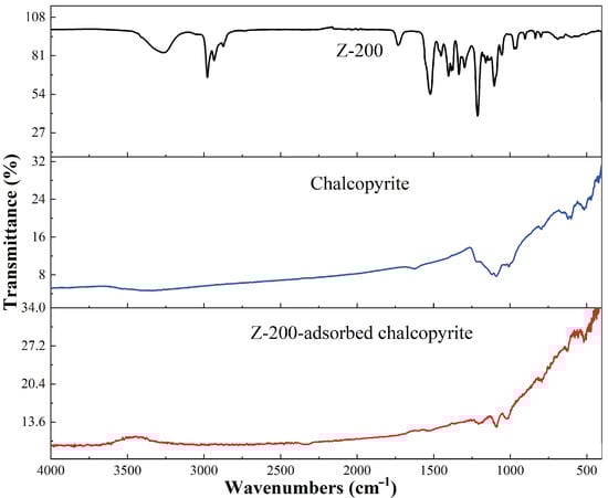 The FTIR spectra of Z-200, chalcopyrite, and Z-200-adsorbed chalcopyrite.