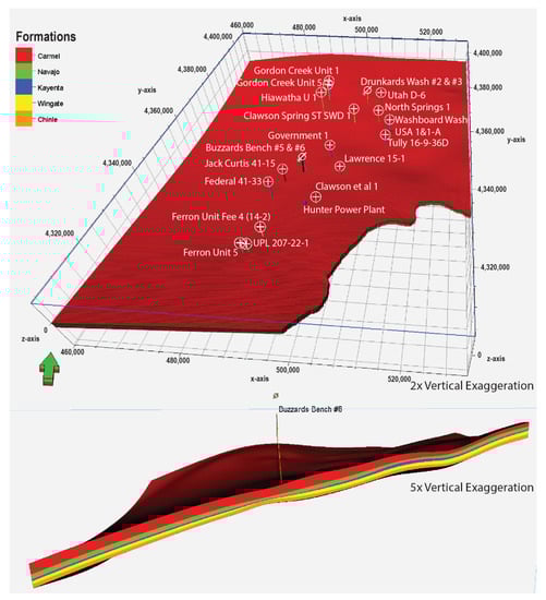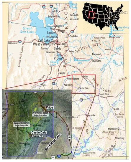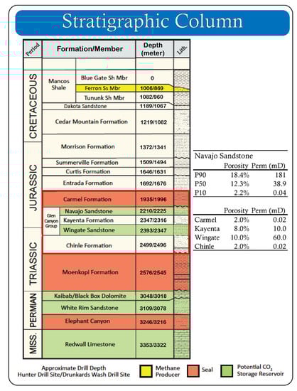 The Price/Castle Dale area is just to the north and west of the San Rafael Swell, a northeast to southwest trending asymmetrical anticline with sedimentary strata of Mississippian to Cretaceous in age [7,8,9]. Two injection sites were evaluated, the primary site is located west of Castle Dale in the Buzzards Bench gas field, and a secondary site just south of Price in the Drunkards Wash gas field (Figure 1). Both sites currently produce gas and water from the Ferron coal and sandstone horizons, a Cretaceous aged sandstone and coal formation covering much of the area to the north and west of the Swell. The produced water from the Ferron production operations is injected into the deeper Navajo and Wingate formations for disposal, with injection operations currently ongoing [10]. The sedimentary structures in the area dip 2–5° to the west, consisting of alternating layers of sandstones, limestones, and shales [7,11]. The Glen Canyon Group provides a promising series of target formations with 20–1000 mD permeability, 10–20% porosity, and hundreds of feet of thickness [9,12,13]. The target reservoir is the uppermost formation in the group, the Navajo Sandstone. The Navajo Sandstone is overlain by interbedded, low porosity and permeability shales, limestones, and anhydrites of the Carmel Formation, which create an effective regional seal [12]. The Navajo Sandstone appears to offer the porosity, permeability, overlying sealing layers, and lateral extent to accommodate the project’s target injection mass of 46 million metric tons of CO2.