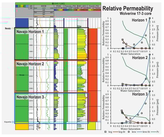 As part of the project’s characterization effort, the relative permeability and capillary pressure were measured for each of the three horizons identified within the Navajo Sandstone. These data were then converted to simulator curves and assigned to each of the three zones in the simulation model. The Wingate and Kayenta formations were assigned a generic sandstone relative permeability curve within Petrel© as no data are published or otherwise available for these formations. The Carmel, the regional seal for the Glen Canyon Group, and the underlying Chinle formations were assigned shale relative permeability curves from Bennion and Bachu (2007) [22]. Figure 3 displays the relative permeability and capillary pressure relationships assigned to each of the three horizons within the Navajo Sandstone. Capillary pressure within all other formations was estimated using the van Genuchten formula [23].