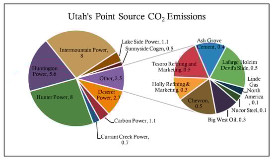 A primary goal of this study is to address the feasibility of storing 46 million metric tons (Mt) of anthropogenic CO2 emissions from a coal-fired power plant under the Colorado Plateau. The Hunter Power Plant (HPP) is the primary CO2 source for this study. The project determined that a realistic capture rate from one of HPP’s generation units was 1.7 Mt per year. At this rate, 27 years are required to capture and sequester 46 Mt of CO2. In addition to the HPP source, CO2 emission data collected as part of an economic analysis for the state of Utah were evaluated to determine sequestration targets for the regional GCS model [24,25,26]. Figure 4 summarizes Utah’s major CO2 point source emitters and their annual emissions. The overwhelming majority of the 30.2 Mt of CO2 emitted in Utah each year is from the energy generation sector. Only about 2.5 Mt of CO2 yearly emissions come from other industrial sources, such as cement manufacturing, petroleum refineries, and steel manufacturing. These data are used to design the injection schedule for regional GCS modeling.