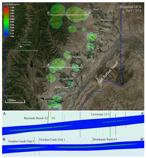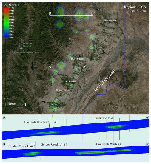 Results from the ‘Regional Capacity’ case showing the CO2 saturation at the top of the Navajo at the end of the simulation (top). Cross-sections A–A’ shows the vertical CO2 saturation profile in the Buzzards Bench area, and cross-section B–B’ shows the vertical CO2 saturation distribution in the Drunkards Wash area (bottom).