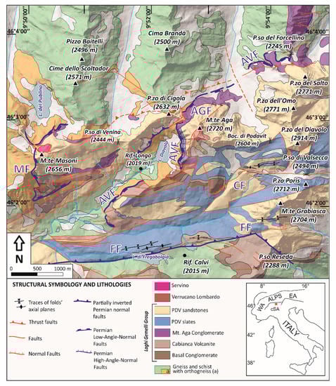 Simplified geological maps of the upper Brembana and Vedello valleys displaying the traces of the Aga-Vedello (AVF) and Masoni (MF) LANFs. AGF: Aga Growth Fault; CF: Camisana Fault; FF: Fregabolgia Fault. The Forcellino Pass is in the NE corner of the map. Modified from [9].
