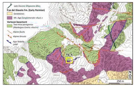 The same structure crops out in the Ambria and Vedello valleys (Figure 1 and Figure 2). Despite the reactivation of the Aga-Vedello LANF during the Alpine shortening, several fault segments preserve the original Permian features and are still observable in the field.