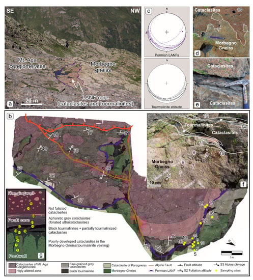 Cataclasites are partially to completely substituted by tourmalinites. Field structural analysis suggests that tourmalinites seal the fault zone and maintain the same attitude of the LANF plane (Figure 4e), with only minor intrusion in the footwall as veins (Figure 6a). The Alpine deformation in the fault core and adjacent wall rocks unevenly resulted in the development of a non-pervasive slaty cleavage, mainly within fine-grained grey cataclasites (Figure 6e,f), but also within black tourmalinites (Figure 5f). The hanging wall is made of coarse-grained proximal conglomerates (Mt. Aga and Vedello conglomerate) with boulders of basement-derived gneisses and mica schists (Figure 5a), whereas the footwall consists of two mica gneisses with diffuse albite peciloblasts (Figure 5b).