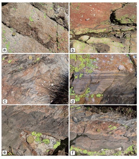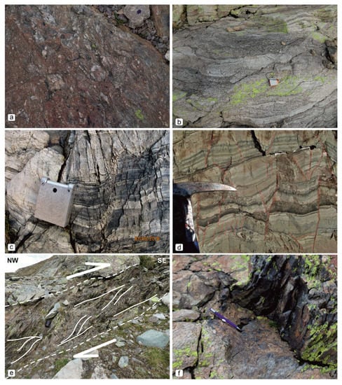 (a) Field aspect of the Aga Conglomerate, with pebbles chiefly made of paragneiss, mica schists and polycrystalline quartz. (b) The typical banded texture of the “Morbegno Gneiss” rich in albite peciloblasts. Syn-sedimentary normal faults within volcaniclastic sandstones of the upper part of the Mt. Aga Conglomerates to the north (c) and southeast (d) of the Forcellino Pass. These faults show very similar features with the syn-sedimentary faults described in the nearby Cima Aga area (Figure 2) in the hanging wall of the same LANF [9]. (e) S-C structures developed within Aga conglomerates along the Alpine thrusts. (f) Alpine cleavage affecting a black tourmalinite layer within the fault core.