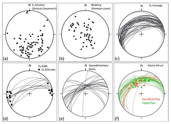 Stereographic projections (equal area, lower emisphere) of mesoscopic structures in the Forcellino Pass area. (a) Poles to planes of the main foliation (S2) in the Variscan basement. (b) Poles to bedding planes in the Pizzo del Diavolo Fm. (c) S3 axial plane cleavage of Alpine age in the hanging wall of the LANF. (d) Axial planes and fold hinges of D3 folds, measured both in the crystalline basement and in the Permian cover. (e) Syn-sedimentary normal faults. (f) Fault slip data related to Alpine thrust at the Forcellino and Cigola passes.