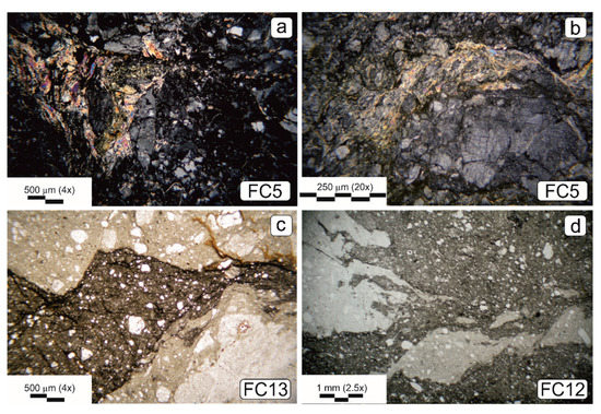 At Forcellino Pass, black tourmalinites represent the strongest effect of tourmalinization; however, there are other, less tourmalinized facies, especially in the basement, in which the replacement by tourmaline commonly follows the main foliation planes, mylonitic bands in strained levels, and discordant fractures. The largest aggregates of tourmaline crystals > 50 μm in size were found (Figure 8c,d, sample FC21) along fractures branching from the fault core in the footwall.