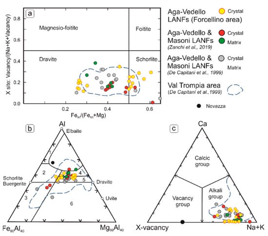 (a) xFe vs X-site alkali occupancy diagram: all analysed tourmaline and tourmalinites plot below the foitite-dravite divide. Tourmalines from the Forcellino Pass area display a clear zoning with Mg-rich cores and Fe-rich rims. The dashed blue line indicates the compositional field of tourmaline from the Trompia Valley area. (b) Fe-Mg-Al diagram [55]. The compositions are within field 4 and 5, typical of tourmalinites in metapelitic and metapsammiti rocks. (c) Classification diagram based on the principal constituent at the X-site [53]; all tourmalines from all the considered areas plot within the Alkali group field.