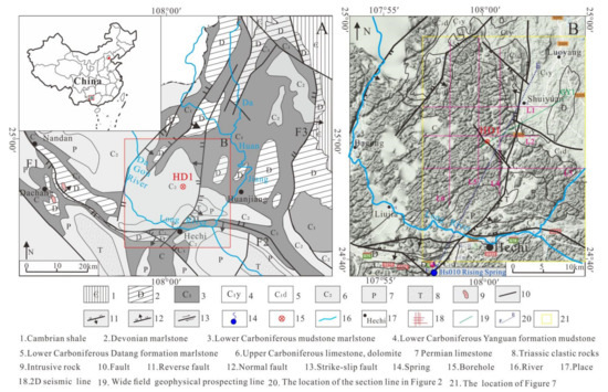Huanjiang Sag is located in the northwest of Guangxi province in southern China (Figure 1) and covers 2000 km2, much of which is covered by Carboniferous rock formations, with only a sporadic occurrence of Permian and Triassic rock formations. A Devonian rock formation is exposed around the sag, and the boundaries of the sag are the North–Northeast and North–West striking faults. After the Carboniferous deposition, the Hercynian movement in this area was in the form of up-and-down movement, while the Indosinian movement was a common and intense fold movement, which ended the marine deposition process in Huanjiang Sag and replaced it with continental deposition. Later, the Yanshan Movement was dominated by the development of NW-striking faults, accompanied by the intrusion of magma. After the Himalayan Movement, folded structures in this area formed mountains. Affected by multi-stage tectonics, ruptures and folds developed in Huanjiang Sag, with more developing in the high angle fault zone. Most of the faults are normal faults, while a few are reverse faults. The general strike of the structure line is in the NNE–SSW direction, with dip angles of 5~20° of strata, and angles of more than 20° only in the vicinity of large fault zones. Trapped syncline and anticline developed in the Huanjiang Sag anticline axis generally exposes silicalite and marlstone of the middle–upper Devonian. The syncline mostly exposes upper Carboniferous, but also lower Permian in the fold axis zone. The dip angle of strata in fold limbs is generally 10–20°, and locally it is greater than 20° [27,28,29].