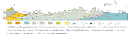 The soluble carbonate rocks in the area are Carboniferous-Permian platform facies carbonate rocks with large area outcropping; however, karstification of marlstone and silicalite in Devonian and clastic rocks in Triassic is not found. The main karst strata are the Datang formation of Lower Carboniferous, the Dapu, Huanglong, and Maping formations of Upper Carboniferous, and the Qixia, Maokou, and Heshan formations of Permian, with an accumulative thickness of thousands of meters (Figure 2). Except for the Dapu formation, which is a set of fine–medium dolomites and lime–dolostone, the formations are pure limestone, which belongs to the continuous formation of mega-thick carbonate rocks (>2000 m) with strong solubility [16]. The argillaceous content in the lower part of Lower Carboniferous increases and gradually transitions to the large shale of the Yanguan formation of the Lower Carboniferous, which is the bottom boundary of karstification [16].