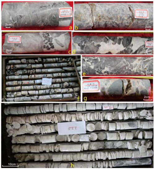 Rock network cracking: Rock fragmentation caused by tectonic movement, forming multiple sets of microcracks (Figure 3a,b), expansion or filling along cracks (Figure 3b,f). Network cracks are formed in the core, or dissolution pores are formed along the cracks. Patchy rock: tectonic movement causes the rock to break up, forming large fractures that diffuse along the fractures and fill with white calcite or dolomite to form white patches (Figure 3c,d), which are the result of a combination of tectonics and corrosion. Rock brecciation: Rock is extremely broken due to tectonic movement, forming breccia. There is fluid activity between the breccias, filled with white dolomite or calcite (Figure 3c–e). Growth of fault calcite veins: intense tectonic movement causes the rock to dislocate or break, with no bedrock in the core, all later filled with white calcite (Figure 3h).