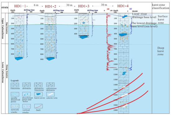 The drilling site is located at an altitude of about 200 m, so 200 m above the well is defined as the surface karst that may be affected by the discharge datum, and below 200 m as the deep karst zone (Figure 5). According to the analysis of karst morphology, the deep karst of the four wells is mainly composed of network cracks, solution-expanding holes along the cracks, and dolomite honeycomb holes, and large karst caves are also developed. Through the comparative analysis of four wells, it was found that the development of deep karst caves has the characteristics of multi-layer superposition. According to depth, this can be divided into a 230 m corrosion cavity section, a 450 m fracture cavity section, an 850 m fracture cavity section and a 1200 m fracture cavity section. Additionally, a large number of network cracks and expansion karst cracks develop near the caves (Figure 4). According to the comparison of the filling characteristics of each section, it was found that the depth of 0–1200 m in the deep dissolution space is strongly corroded, and the overall filling degree of the dissolution space is mainly un-semi-filling. It can be seen as a two-stage filling, filled with calcite in the first stage and refilled with mud in the second stage. Through core observation, it was found that the earthy yellow mud fillings decrease in number after the 850 m karst cave section in the deep karst space, and that calcite increases below. However, calcite infected by brick red could be found in caves at depths of 1218 m (Figure 4e). Brick-red material represents iron oxidation, indicating that surface water can infiltrate to 1218 m, yielding dissolution and oxidation. There are three thick calcite veins below 1400 m (Figure 3h and Figure 5), and the single layer thickness reaches 6 m. The cracks are developed in the upper and lower bedrock, which is speculated to be the core of the fault. Brick red represents iron oxidation, indicating that surface water can penetrate all the way to 1218 m for dissolution and oxidation.