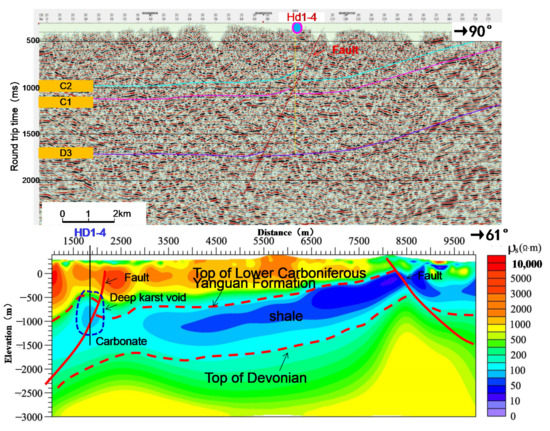 Distribution pattern of deep karst fracture-cavities controlled by a reverse fault in Huanjiang Sag. The width and height of karst voids was identified by the wide-field electromagnetic method (Figure 6).