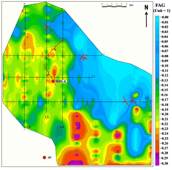 The strata and faults were interpreted by using ‘Discovery 2015′ software, LandMark company, Aventura, FL, USA (before and after seismic profiles are explained in Supplementary Material Figures S4–S9). Seismic wave frequency attenuation gradient technology was used for plane karst fracture and cave prediction [35]. When seismic waves propagate underground, the high-frequency components attenuate faster, and the attenuation of seismic waves is proportional to the frequency [35]. When there are fractures and caves in the formation or the reservoir is rich in fluid media, the absorption effect of the formation will be stronger. It is stronger, the greater the attenuation gradient. Some scholars have used this method to identify carbonate cave reservoirs in the Tahe Oilfield, China, and the application effect was good [36]. ‘EPoffice EPS+’ software, LandOcean energy services compangy, Beijing, China, was used to identify the fractures and caves. A large attenuation gradient indicates fractures and caves, which are represented with red color in the plan figure.