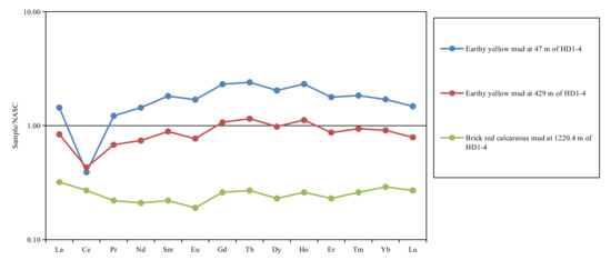 Samples of mud filled from fractures and caves at different depths in Well HD1–4 were collected to carry out rare earth tests and analyses, including yellow mud filled with soil from the 47 m fracture (Figure 4a), yellow mud filled with soil from the 429 m cave, and brick-red calcareous mudstone from the 1220.4 m fracture (Figure 4e). The rare earth element standardization of sedimentary rocks usually uses North American shale (NASC) or post Archean shale (PAAS) as the standard value [41]. In this paper, the NASC standard value remeasured by Gromet et al. [42] is used for standardization. The test results were standardized with North American shale to form a rare earth distribution pattern (Figure 8). It was found that the REE distribution curves of mud filled in 47 m cracks and mud filled in 429 m caves had a good similarity and affinity, both showing that light rare earth was slightly lower than heavy rare earth, and Ce was negative. The REE distribution curves of calcareous clays filled in 1220.4 m cracks are different from those of the above two types of mud fillings in the karst caves. The light and heavy rare earth elements are depleted, but the curves are relatively flat. They have poor affinity.