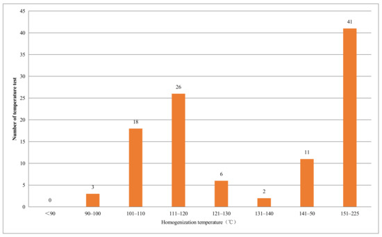The temperature measurement results of gas–liquid two-phase inclusions show that the lowest homogenization temperature was 93 °C, and the highest was 225 °C. The low temperature inclusions below 90 °C are not detected, but there are a large number of single-phase inclusions in some calcites, and there is a room temperature to form calcite inclusions. According to the homogenization temperature distribution range of the inclusions (Figure 9), the inclusions were mainly distributed in two temperature ranges, of 100–120 °C and greater than 150 °C, of which 44 samples were in the range 100–120 °C and 41 samples were in the range greater than 150 °C, indicating that the inclusions are mainly formed in these two temperature ranges. According to the inclusion salinity (wt.% NaCl) calculated by freezing point temperature (Supplementary Material Table S1), 0.35% of low salinity inclusions and 14.57% of high salinity inclusions exist in deep karst space, reflecting the infiltration of low salinity fresh water in the deep karst space and the existence of high salinity formation water under closed burial conditions.
