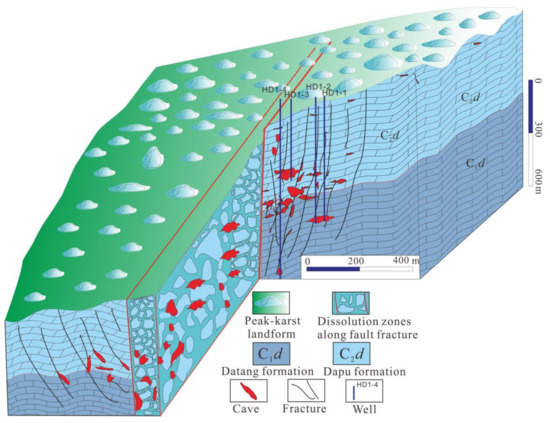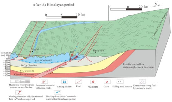 The formation of deep karst around Huanjiang is due to the comprehensive effects of Yanshanian hypogene hydrothermal karst and post Himalayan meteoric water deep circulation karst (Figure 11 and Figure 12). The basic conditions of deep karst development are thick carbonate rocks of Carboniferous and developed faults, and further, the fluid activities in different periods lead to the inherited development of deep karst.