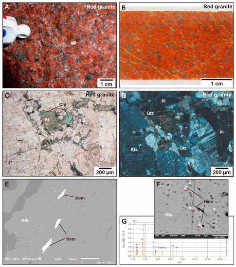 Red granite textures: (A,B) Red granite with medium-grained isotropic texture; biotite crystals altered to chlorite; photographs come from underground mine (A) and from borehole (B); (C,D) Photomicrographs in natural (C) and polarized (D) light of the red granite with biotite altered to chlorite, in a medium-grained isotropic texture (thin section of sample from underground mine); (E) scanning electron microscopy (SEM)/back-scattered electron (BSE) image showing elongated hematite crystals in planes parallel to the K-feldspar cleavage; (F) Hematite crystals in pores of K-feldspar with location of energy-dispersive spectroscopy (EDS) analyses (SEM-BSE image); (G) EDS spectrum indicating the presence of Fe in the inclusions analysed. Abbreviations: Bt—biotite; Chl—chlorite; Hem: hematite; Kfs—K-feldspar; Pl—plagioclase; Qtz—quartz.