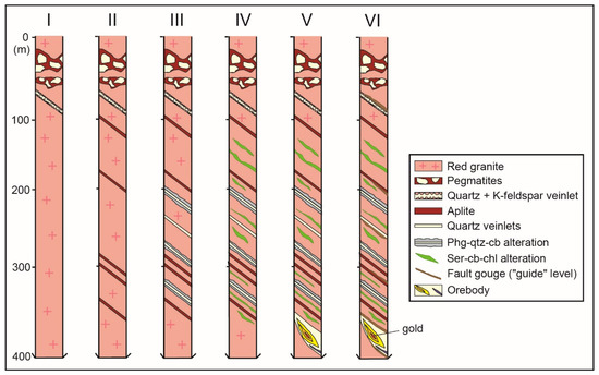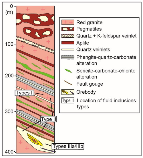 In the Barreiro zone, two types of alteration that affected the red colour granite of the Passa Três intrusion have been recognised. Their distribution along a vertical section is represented in Figure 6, which is based mainly on drill core observations. The upper part of each section systematically shows abundant markers of late-magmatic and magmatic–hydrothermal features such as UST, pegmatite pockets, and intense quartz-rich veining assimilated to stockscheider. These textures have been interpreted as typical for a granite cupola environment [10]. The two stages of hydrothermal alteration, associated with the mineralisation, were identified as phengite–quartz–carbonate (PQC) and sericite–carbonate–chlorite (SCC) alterations (Figure 6), based on petrographic observations, QEMSCAN, EPMA, lithogeochemistry, and SEM analyses. The PQC alteration is only developed within narrow grey colour zones frequently parallel to the earlier barren quartz veins during magmatic–hydrothermal transition. Conversely, the SCC alteration is characterised by a greenish colour zone, occurring systematically close to the mineralised veins and frequently associated to breccias.