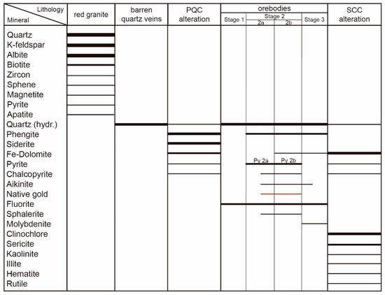 Paragenetic sequence of the red granite, barren quartz veins, mineralized veins, and hydrothermal alteration at the Passa Três gold deposit. The width of the solid lines denotes the relative abundance of minerals. The late argillic alteration in the deposit is not indicated. Criteria for differentiation between phengite and sericite is based on grain size.
