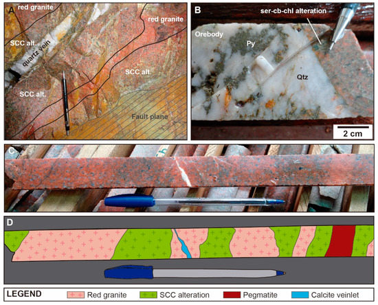 Sericite–carbonate–chlorite (SCC) alteration in the Passa Três deposit: (A) Zebra pattern formed by the alternation of greenish granite (SCC alteration) and red granite near orebody; (B) SCC alteration along the border of a quartz–sulphide vein (borehole sample); (C,D) Drill core sample exhibiting zebra-pattern (C) and its schematic drawing (D). Abbreviations: Py—pyrite; Qtz—quartz.